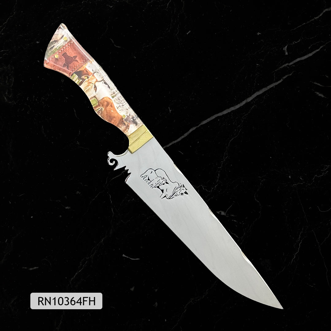 Faca artesanal personalizada com cabo em acrílico de alta resistência. Pode ser personalizado o cabo com impressão de alta qualidade e lâmina com gravação a laser ou vazada.