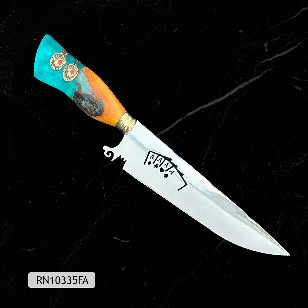 Faca artesanal personalizada com cabo híbrido (resina e madeira). Pode ser personalizado o cabo com pingente e lâmina com gravação a laser ou vazada.