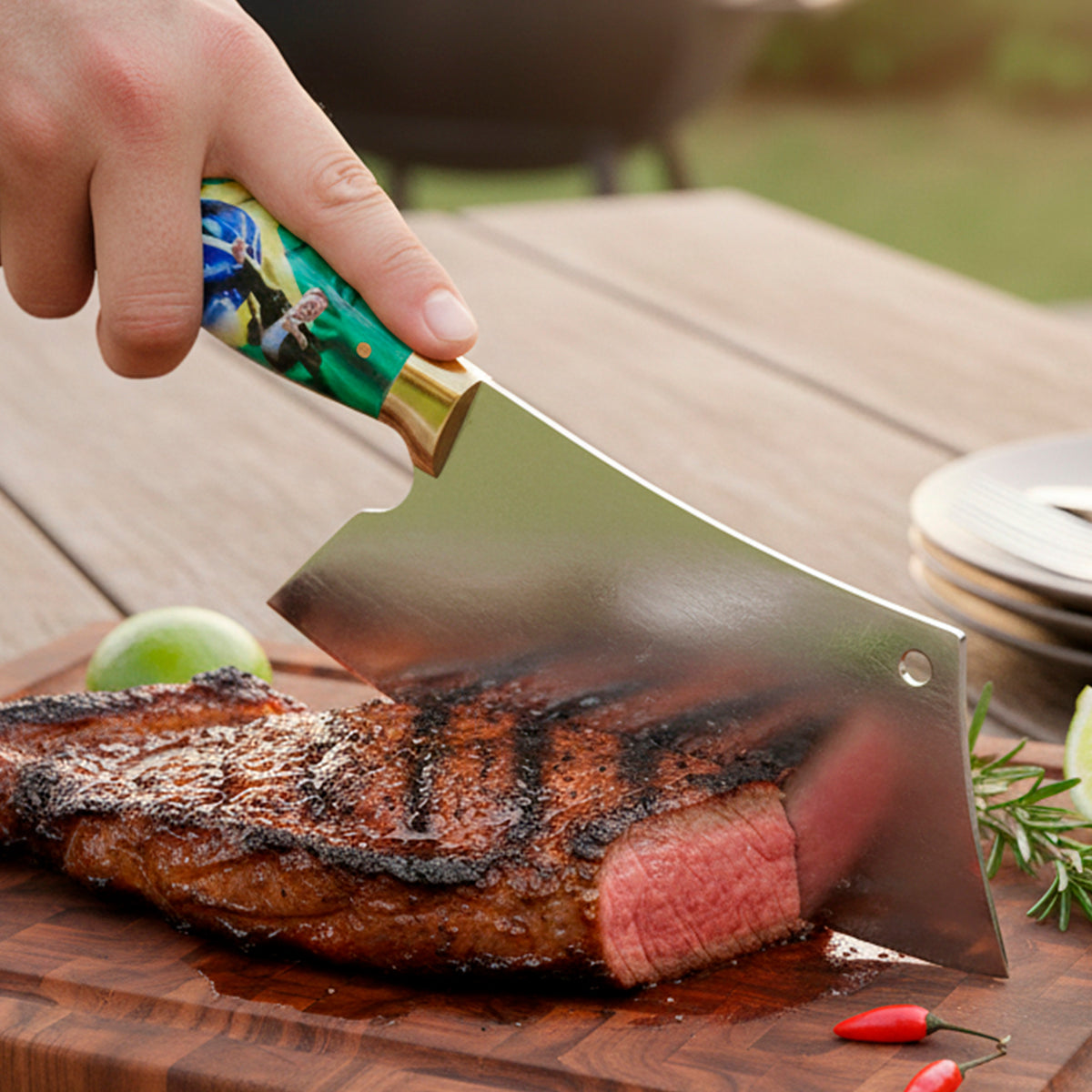 Prepare o seu churrasco com estilo e personalidade! Este robusto cutelo de aço inox é a ferramenta perfeita para cortes precisos, destacando-se por seu cabo exclusivo. Uma peça indispensável para todo churrasqueiro e admirador que deseja adicionar um toque único à sua coleção.