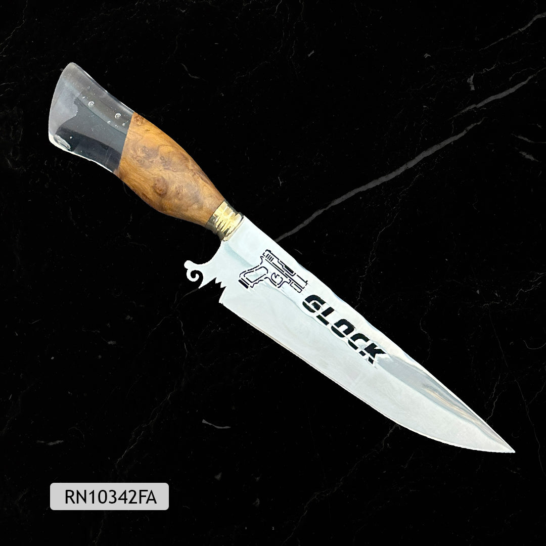 Faca artesanal personalizada com cabo híbrido (resina e madeira). Pode ser personalizado o cabo com pingente e lâmina com gravação a laser ou vazada.