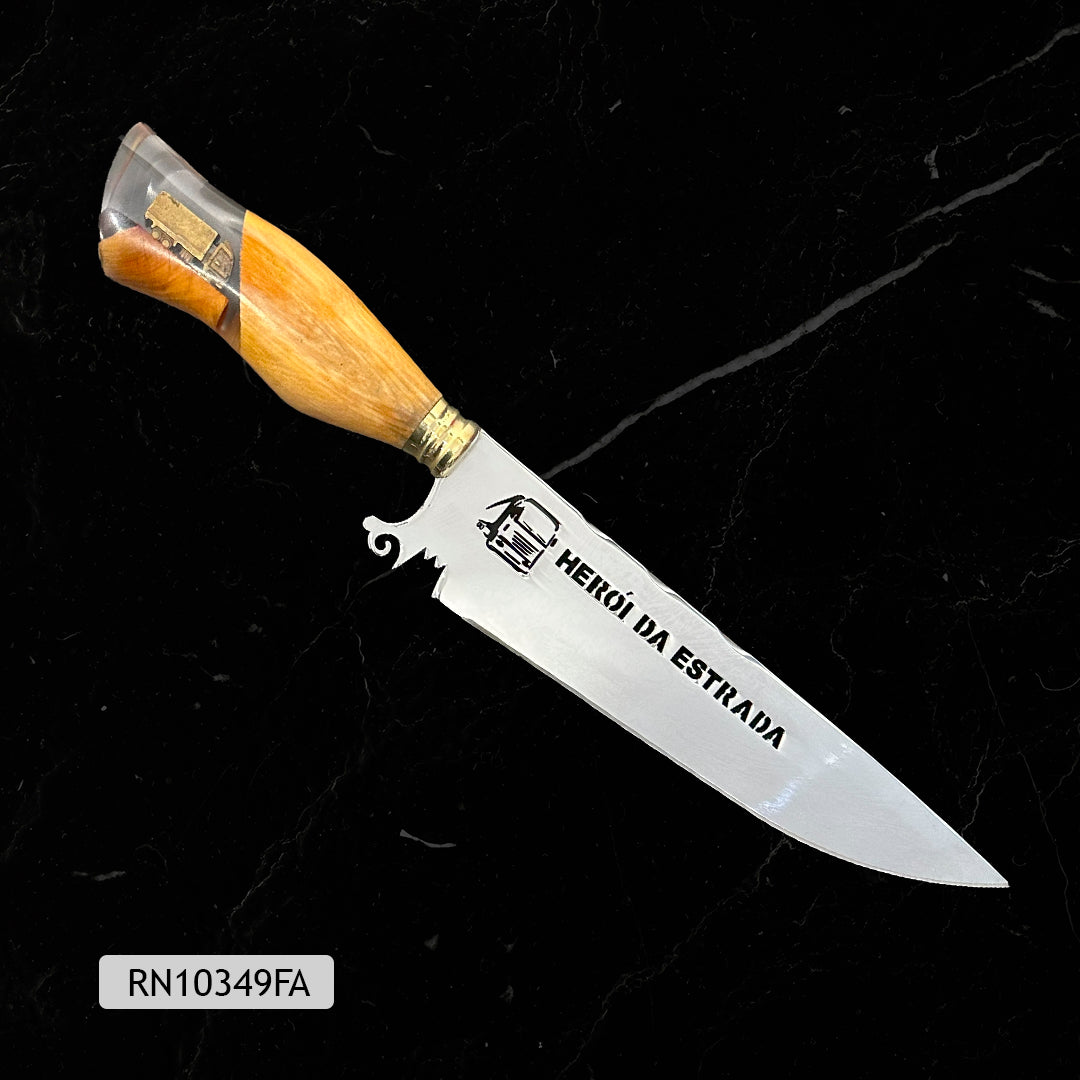 Faca artesanal personalizada com cabo híbrido (resina e madeira). Pode ser personalizado o cabo com pingente e lâmina com gravação a laser ou vazada.