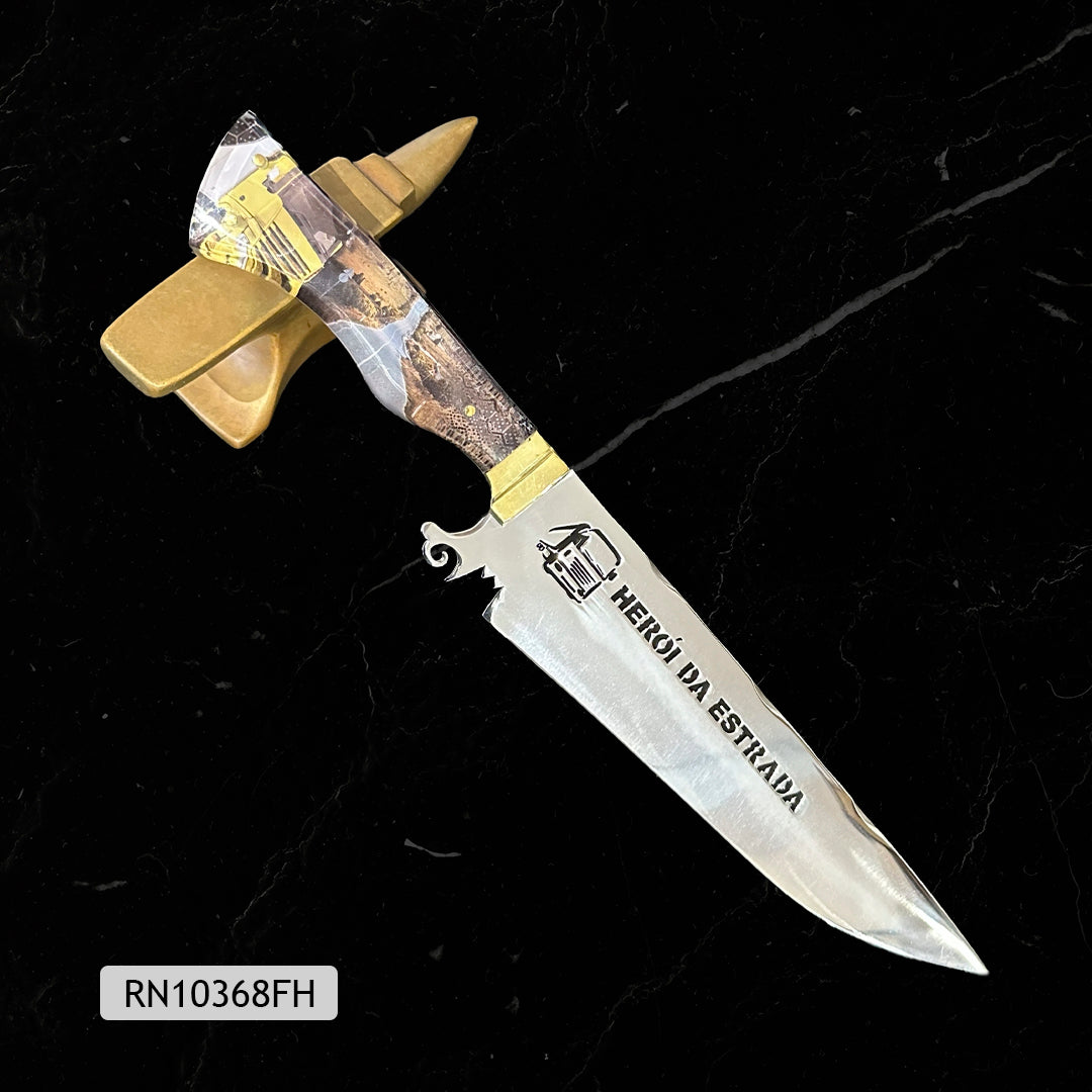 Faca artesanal personalizada com cabo em acrílico de alta resistência. Pode ser personalizado o cabo com impressão de alta qualidade e lâmina com gravação a laser ou vazada.