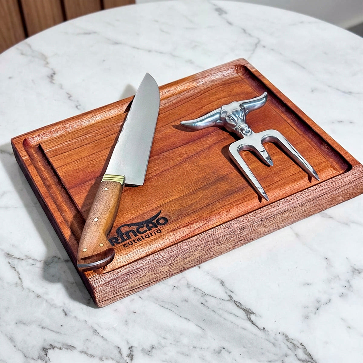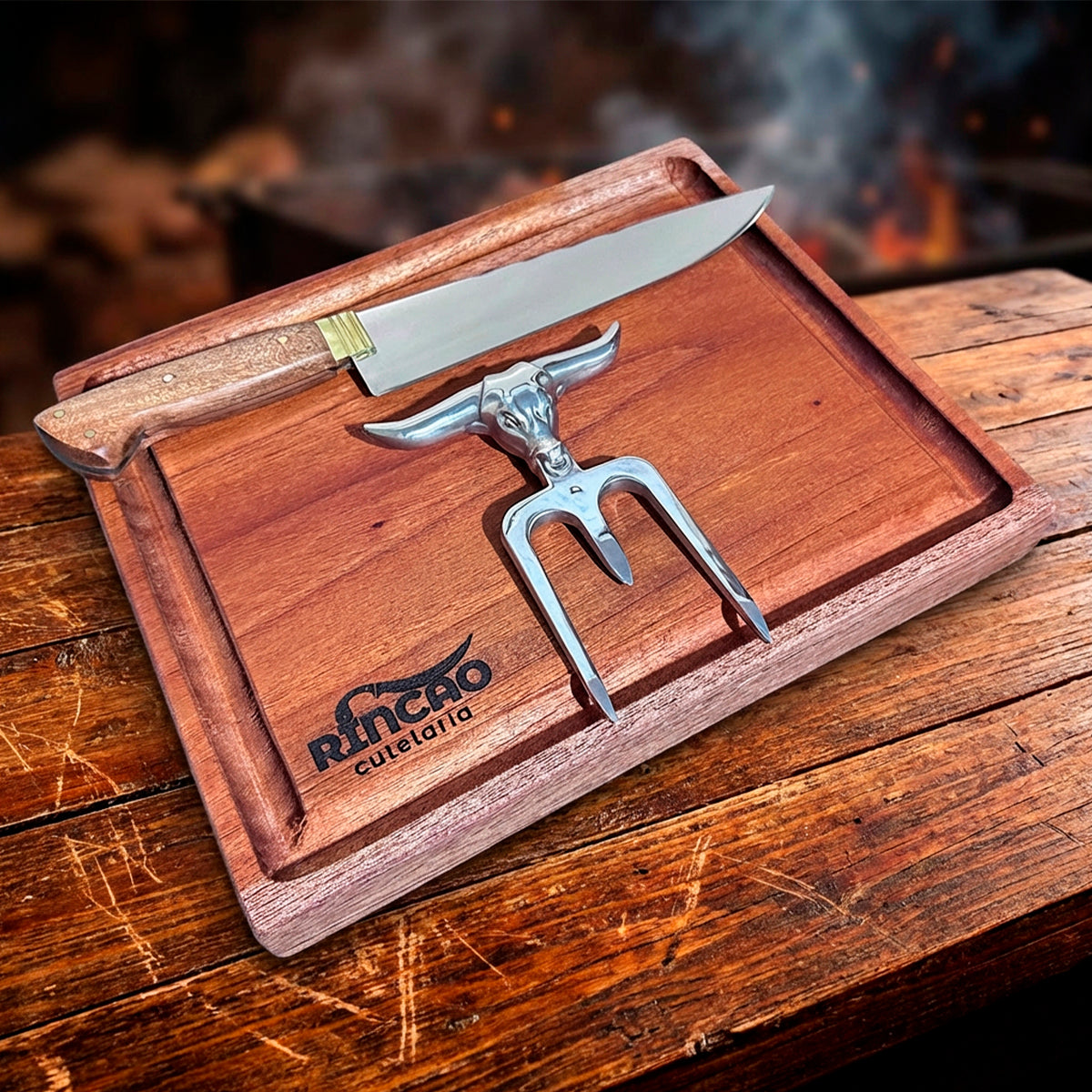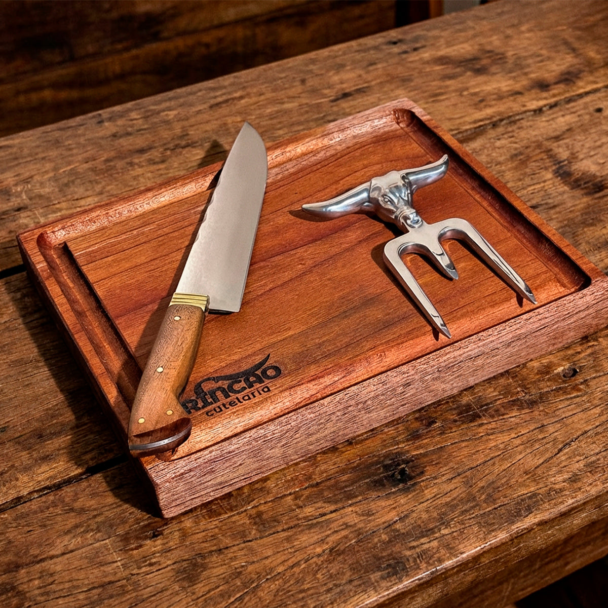 Kit Churrasco Premium - Tábua de Madeira, Faca 8" e Garra de Touro