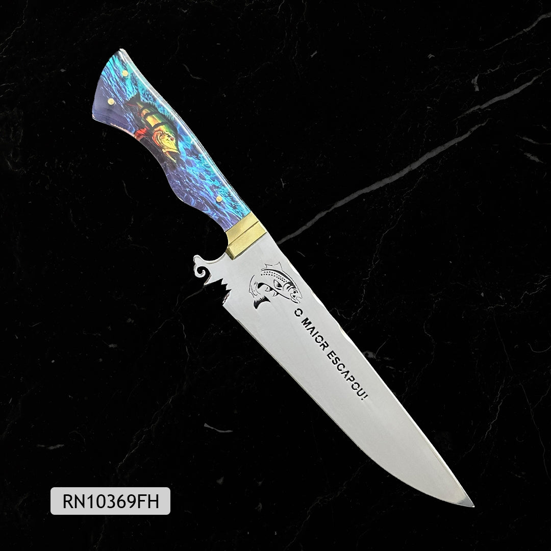 Faca artesanal personalizada com cabo em acrílico de alta resistência. Pode ser personalizado o cabo com impressão de alta qualidade e lâmina com gravação a laser ou vazada.