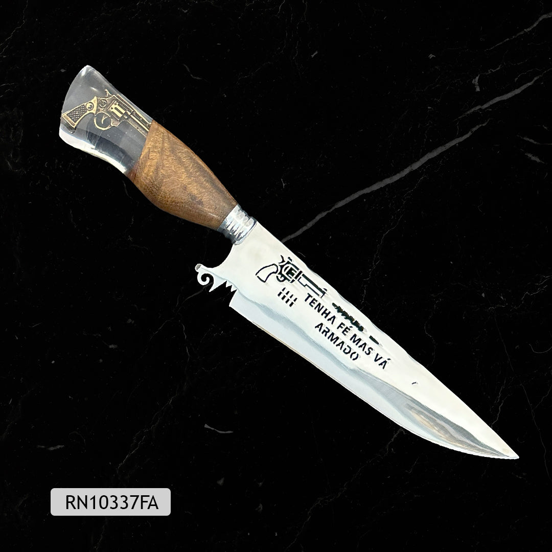 Faca artesanal personalizada com cabo híbrido (resina e madeira). Pode ser personalizado o cabo com pingente e lâmina com gravação a laser ou vazada.